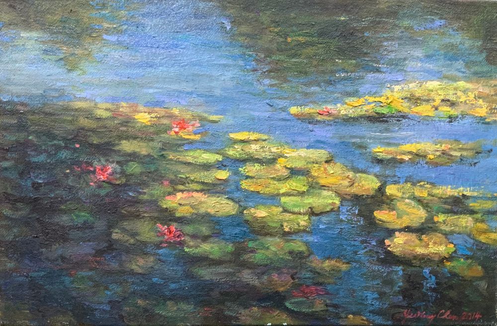 另一類作品則以簡化的方式呈現,她利用厚塗的油彩肌理和色塊的堆疊,捨棄細節,展現純藝術的美感,為觀眾提供更多的想像空間。在這些作品中,她運用了油彩和壓克力等不同媒材,以及各種技巧,如厚塗、稀釋、刮擦等,來表現出豐富的質感和肌理。