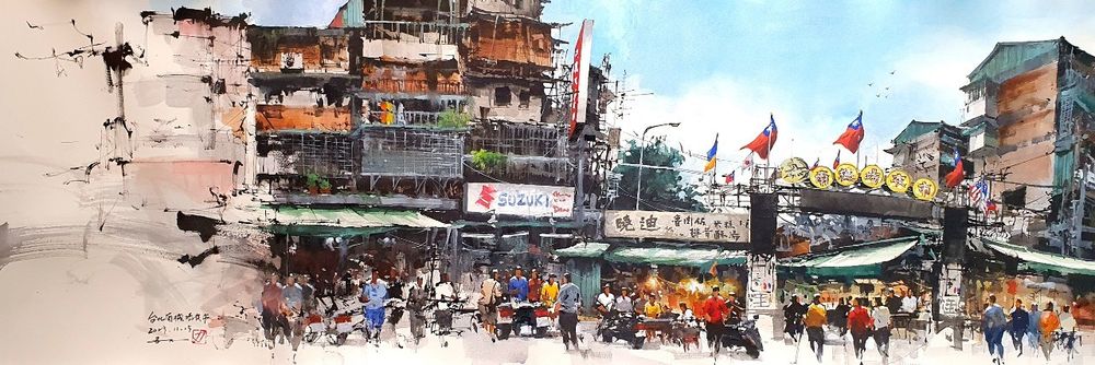 阿力的創作主題廣泛多樣,包含了美食小吃、旅行冒險、菜市場的熙攘景象、令人陶醉的自然風景、社會運動的熱情、節慶廟會的盛大氛圍,以及疫情下的街景和選舉場景等等。她的畫作不僅僅是一幅靜態的畫面,更是一個時光隧道,帶領觀眾走進她的生活世界,感受其中的情感溫度。