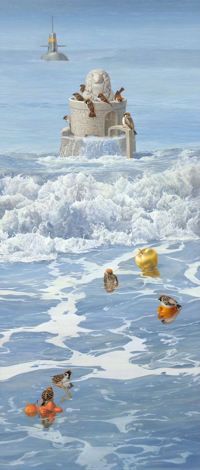 海浪奔騰不止,是無常與風險的象徵,潛意識的驟雨、命運的沉默、選擇的代價,它既能托起夢想,也能將之吞沒。高聳於浪濤之上的城堡,並非只是遠方的理想國,更是一種被試煉包圍的精神堡壘,棲息於城堡之上的麻雀,象微著「平凡的集體記憶」,是監視者,也是倖存者。這些麻雀像是我們自己,渺小、脆弱,卻不斷適應、不斷準備,在風暴未起之前靜靜凝祭意念。而他們棲息的城堡,看似堅固,實則不然,如同人對秩序、理想或權力的投射,它聳立於浪尖之上,象徵我們在不確定的現實中構築的夢想,那不是歸宿,而是一個慾望的幻影,建築於波動與危機之中。