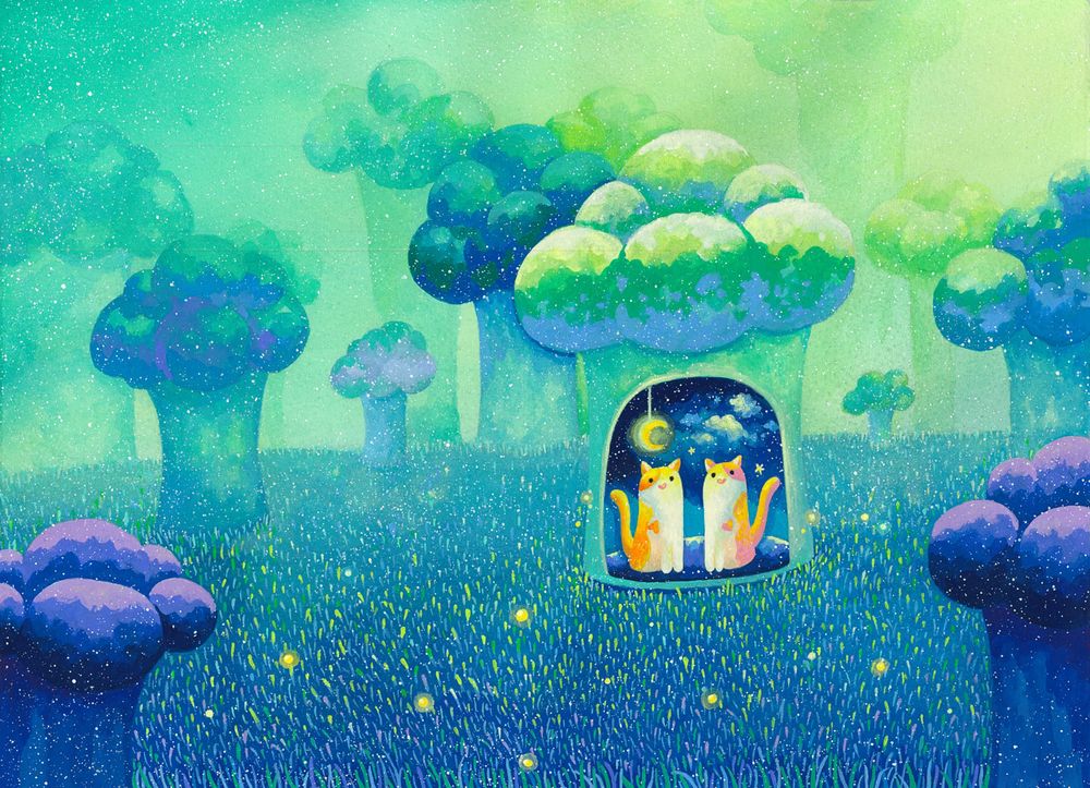 Nyumori的藝術作品如同一場充滿奇幻色彩的夢境,將動物、自然和幻想風景結合在一起,為觀者帶來無限的想像和感動。