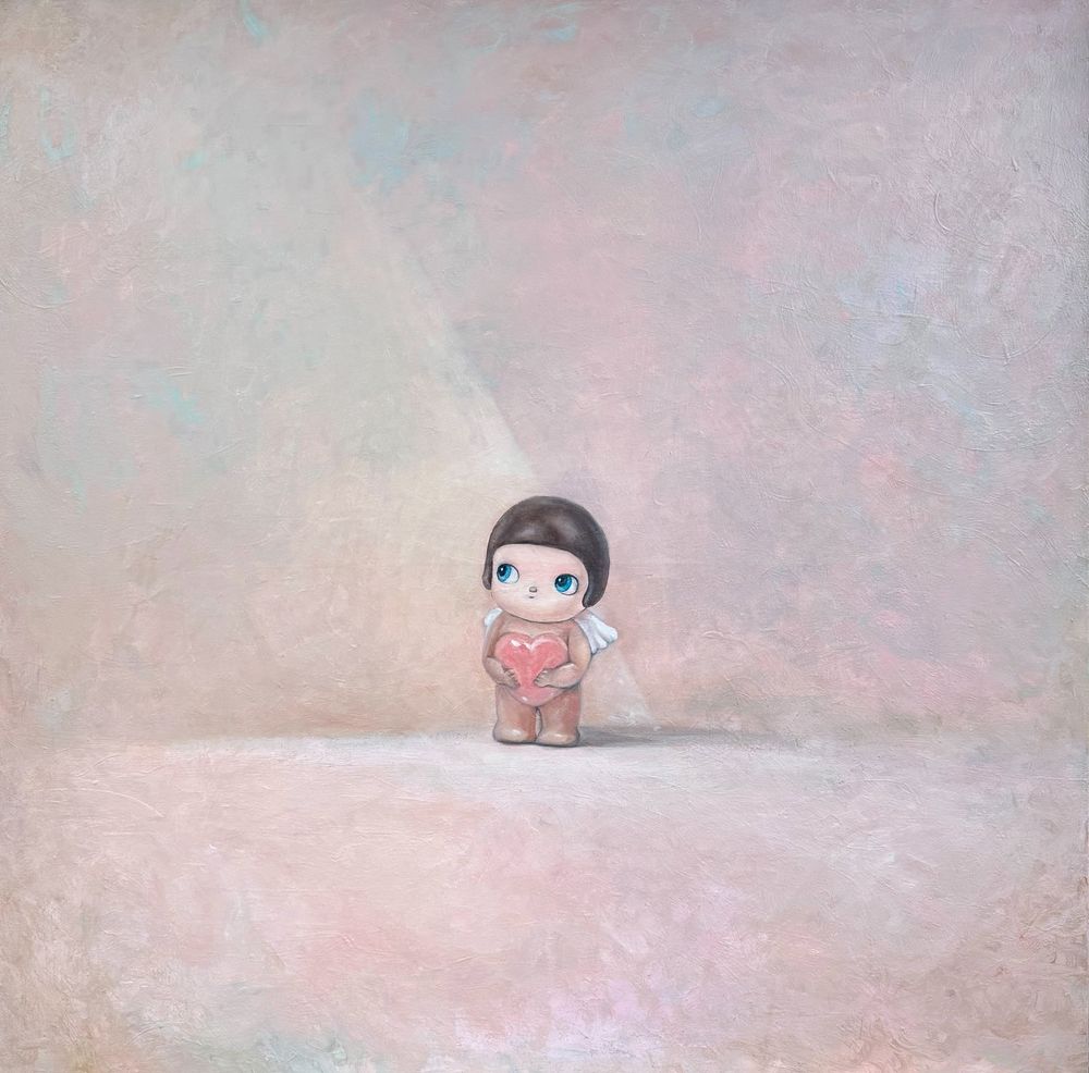 這是「內在安慰」的圖像。即使在浩瀚空曠的世界裡,愛仍能成為最真實的力量。光從天際灑下,光的照耀象徵神聖的臨在,照亮渺小孤單卻勇敢的身影。小卻堅定眼神清澈保有童趣的純真,也帶著近乎宗教式的莊嚴。