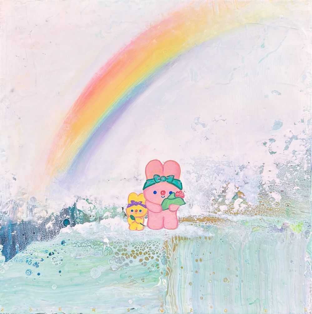下方水波與泡沫的流動,像時間、像眼淚,也像被光輕輕擦拭過的痕跡;而橫跨天際的彩虹,是溫柔的約定。
