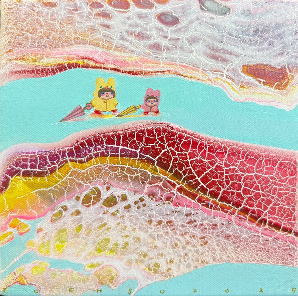 背景龜裂的肌理像乾旱的大地;藍綠的流動象徵雨水到來,河流是恩典滋潤大地、復甦心靈。