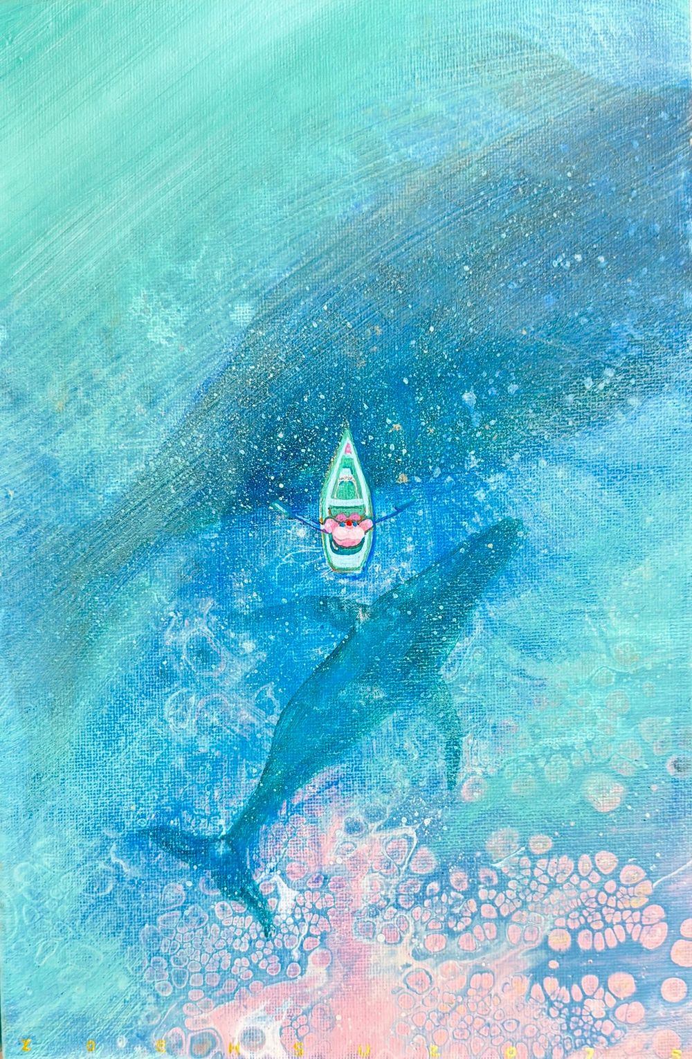 小船孤獨地漂浮在海面下方,一頭鯨魚相隨。牠沉靜而溫柔,並不威脅,而是守護著小小的船隻。