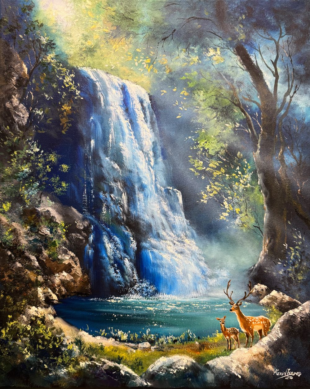 飛瀑茂林 雙鹿財聚
